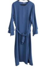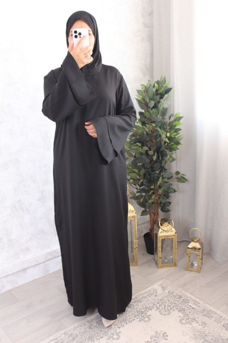 Abaya droite pas cher jazz Assil pour femme avec ceinture pour resserrer à la taille et manches évasées. Tissu jazz mat et légèrement plissé, idéal pour le printemps-été. Disponible de la t52/1m55 à t58/1m70.