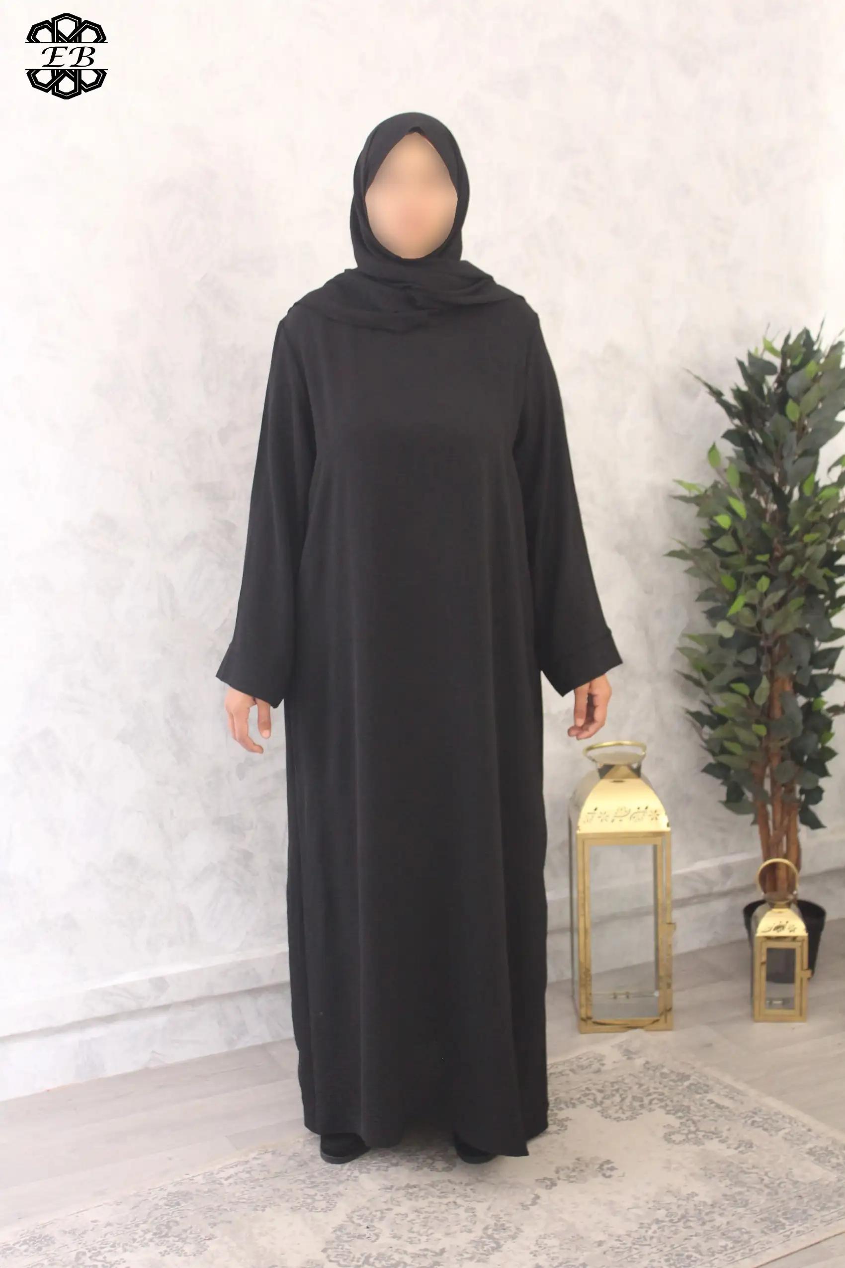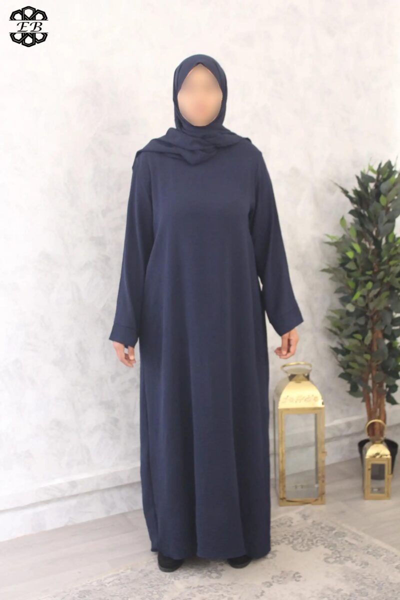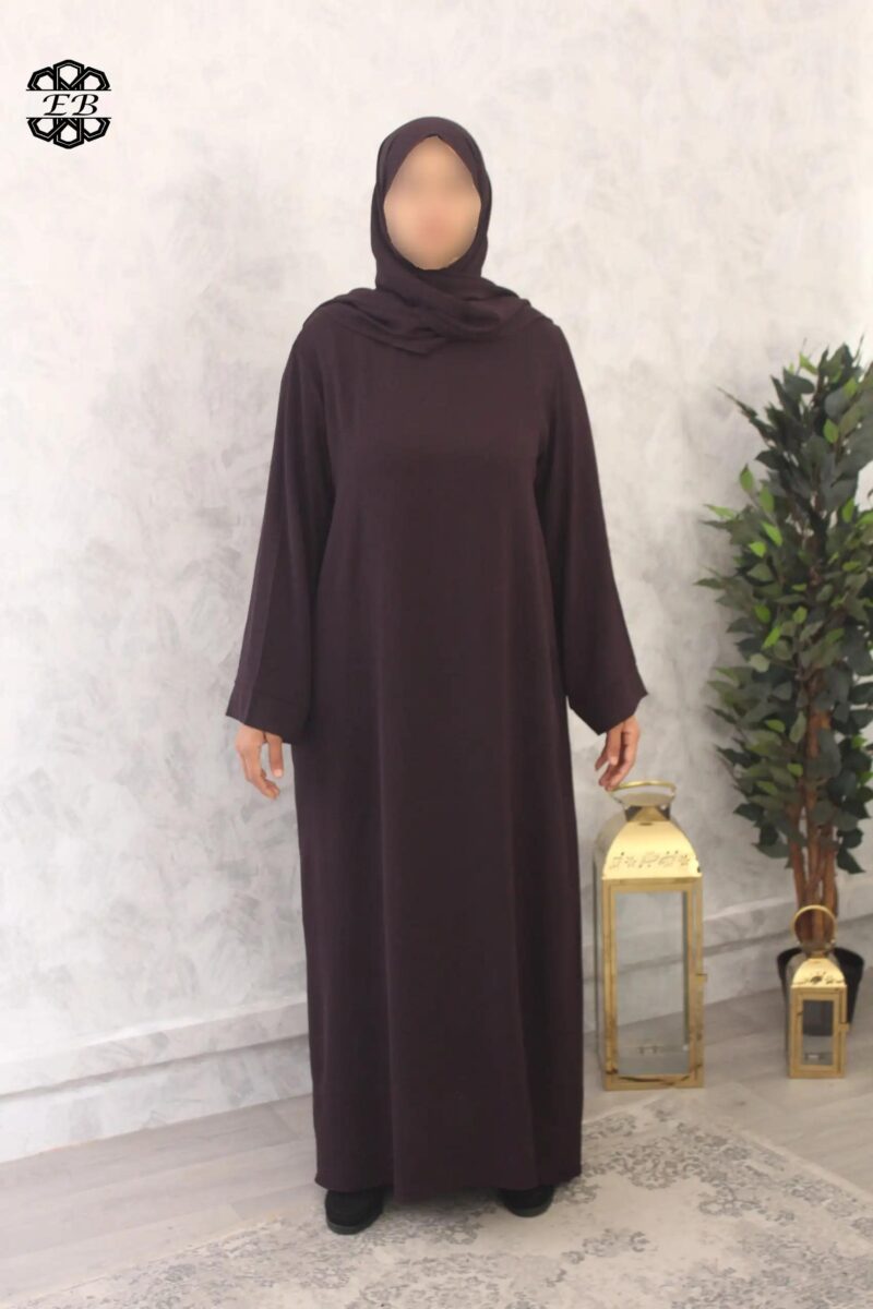 Abaya avec voile intégré droite pas cher jazz Baya pour femme active et pudique. Tissu jazz, mat et légèrement plissé, s’enfile rapidement grâce à son châle intégré. Idéal pour les sorties de tous les jours et la prière à la mosquée ou à la maison. Disponible de la t52/1m55 à t58/1m70.