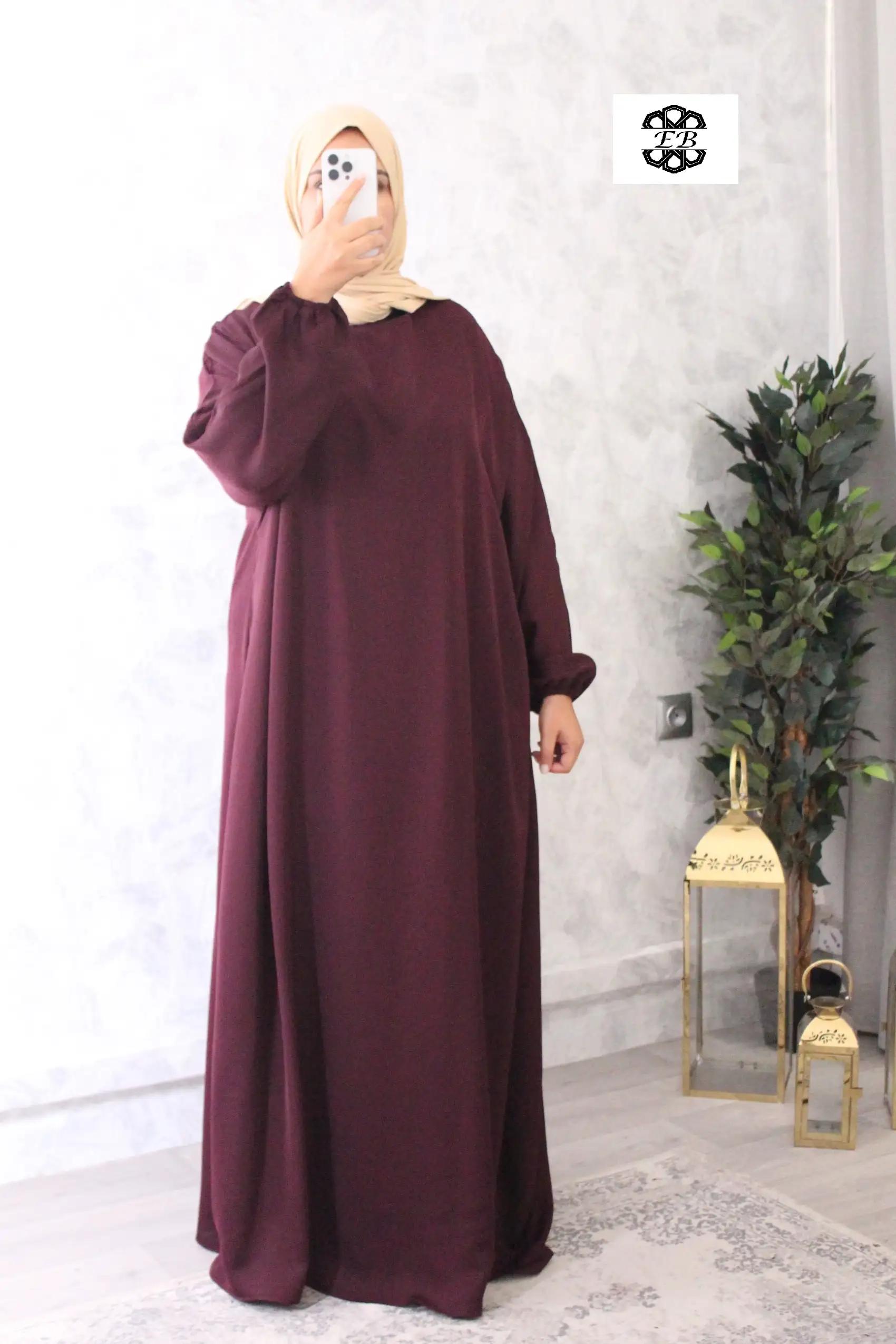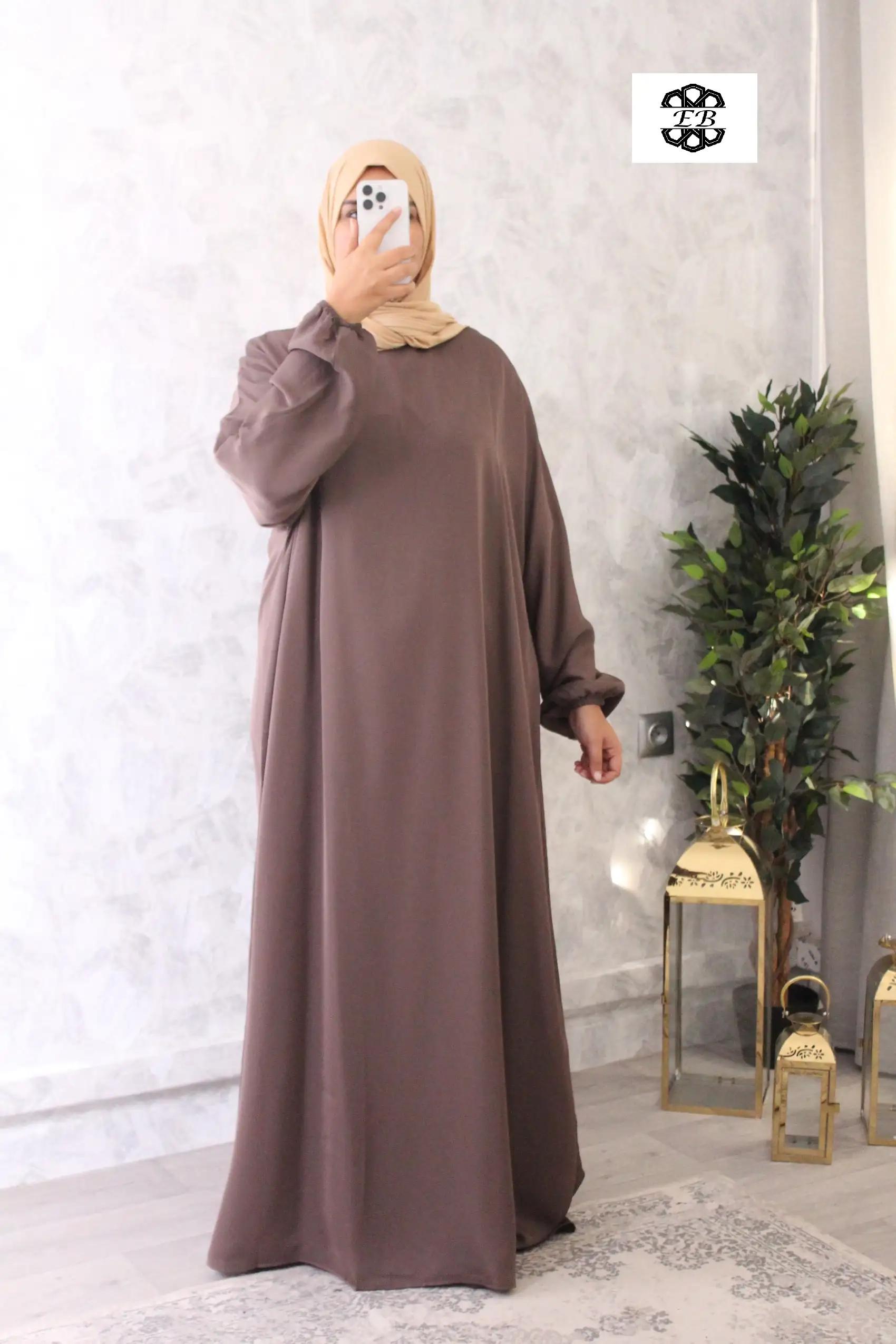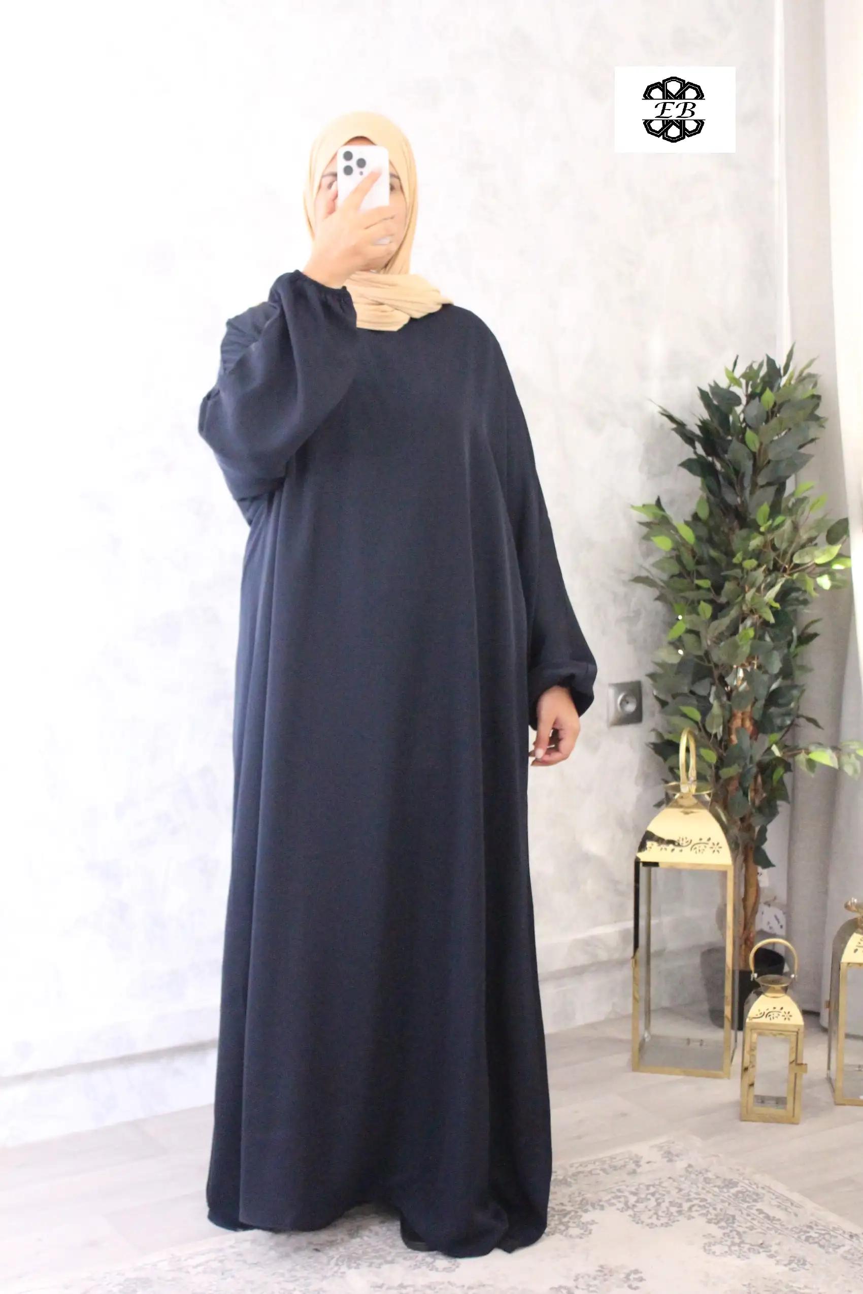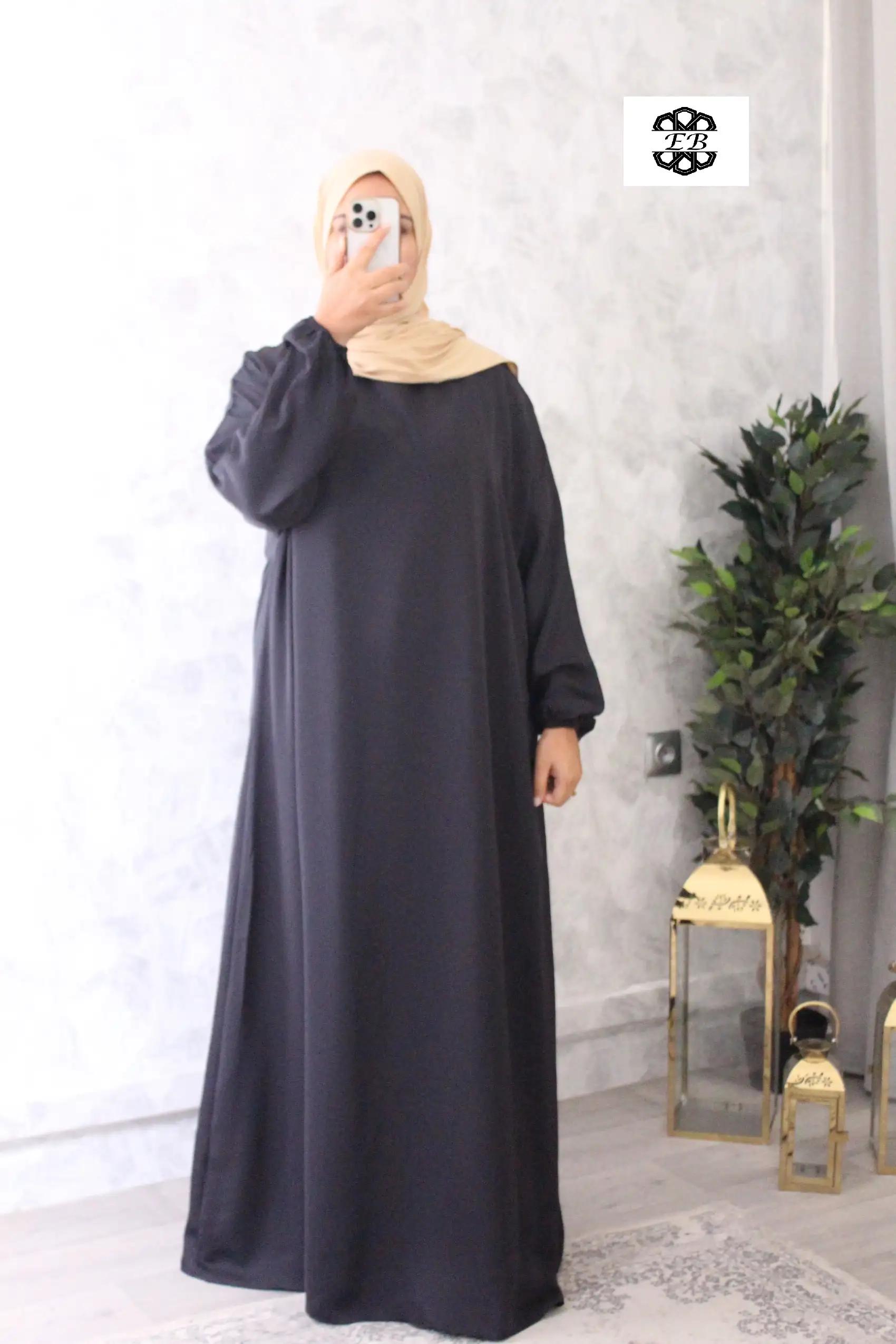 Abaya évasée oversize nida El Bassira Emma e pour femme musulmane voilée. Modèle extra large. Disponible en taille T52/1m55 (1m55-1m60/90 kg max) jusqu’à T64/1m85 (1m80-1m85/120 kg max) . Tissu Nida, doux et léger idéal pour toutes saisons.