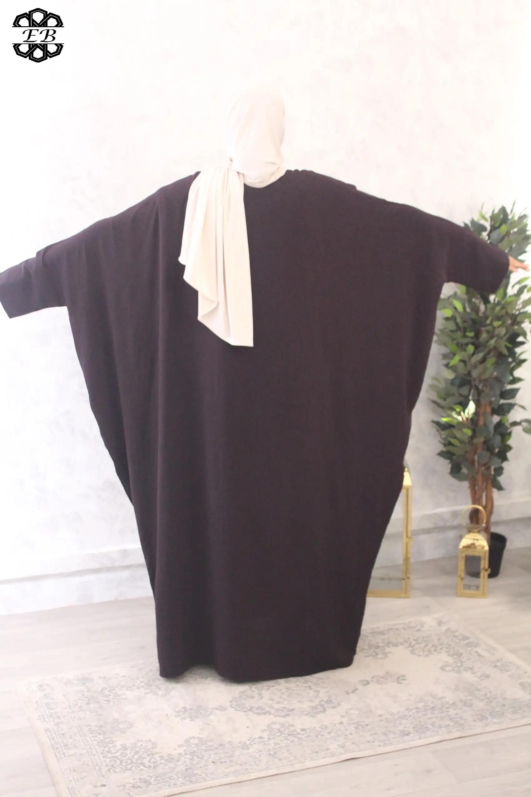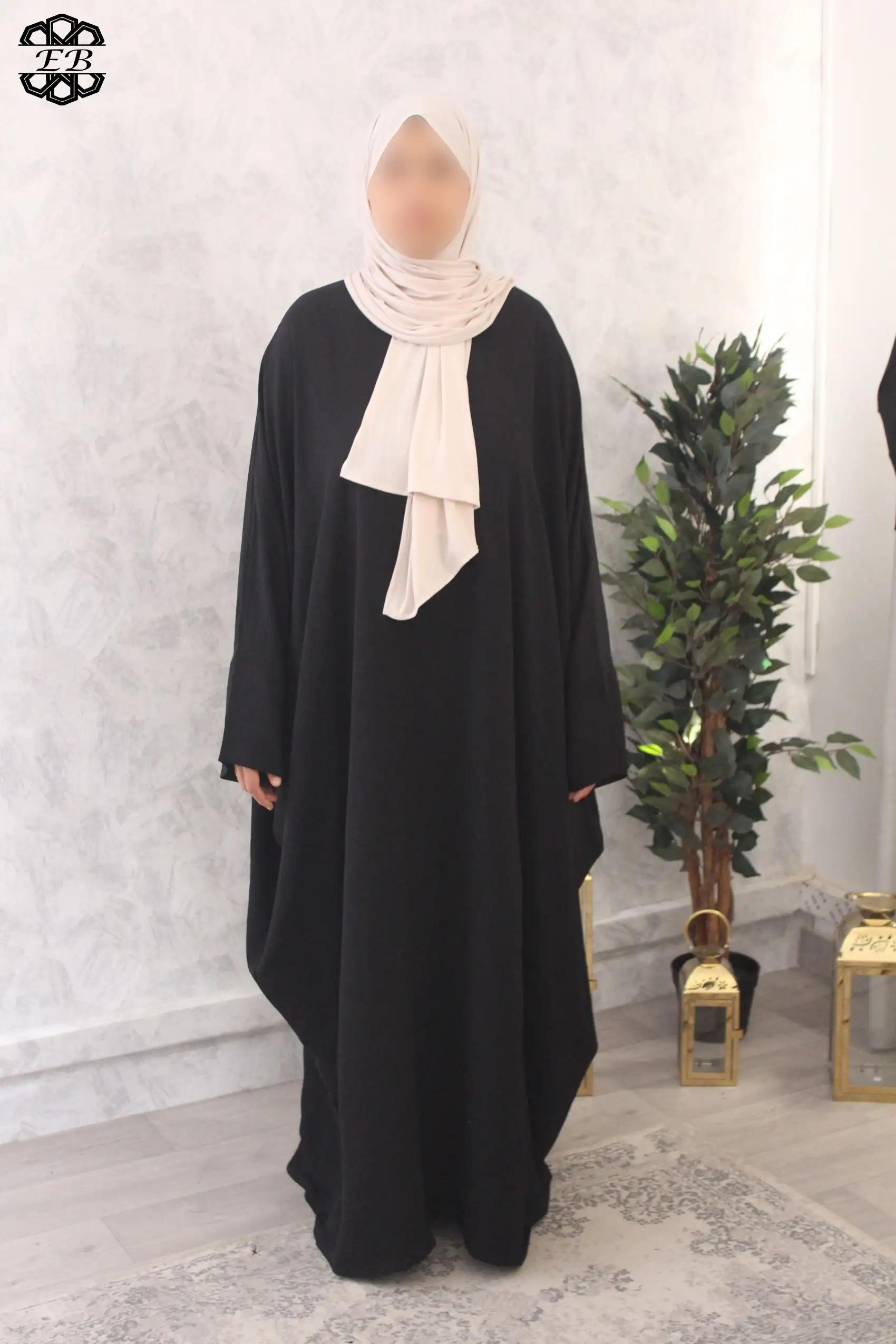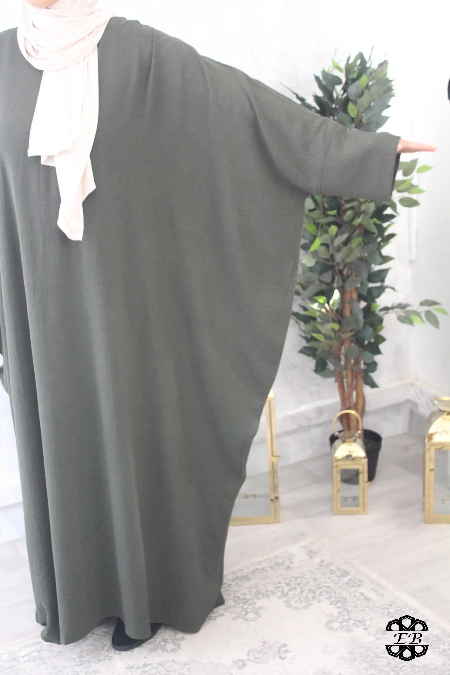 Abaya saoudienne Jazz Kellya by El Bassira Radya p avec manches droites ouvertes pour femme musulmane voilée. Disponible en taille T54/1m60 (1m60-1m65/90 kg max) jusqu’à T60/1m75(1m75-1m80/140 kg max) . Tissu Jazz, mat et légèrement plissé, idéal pour toutes saisons.