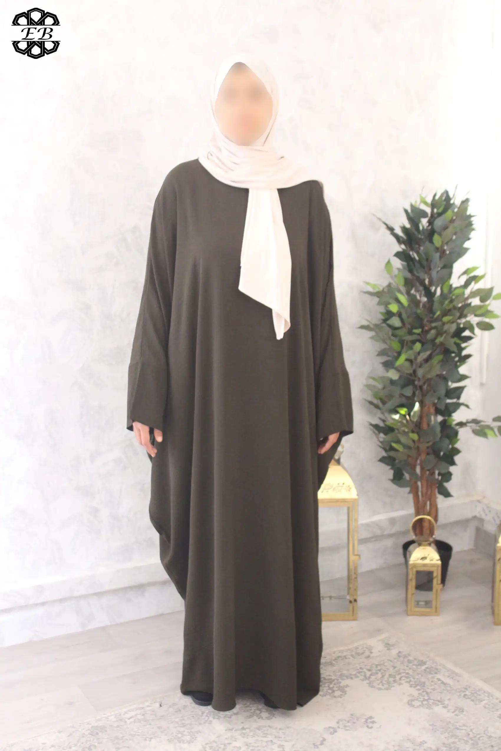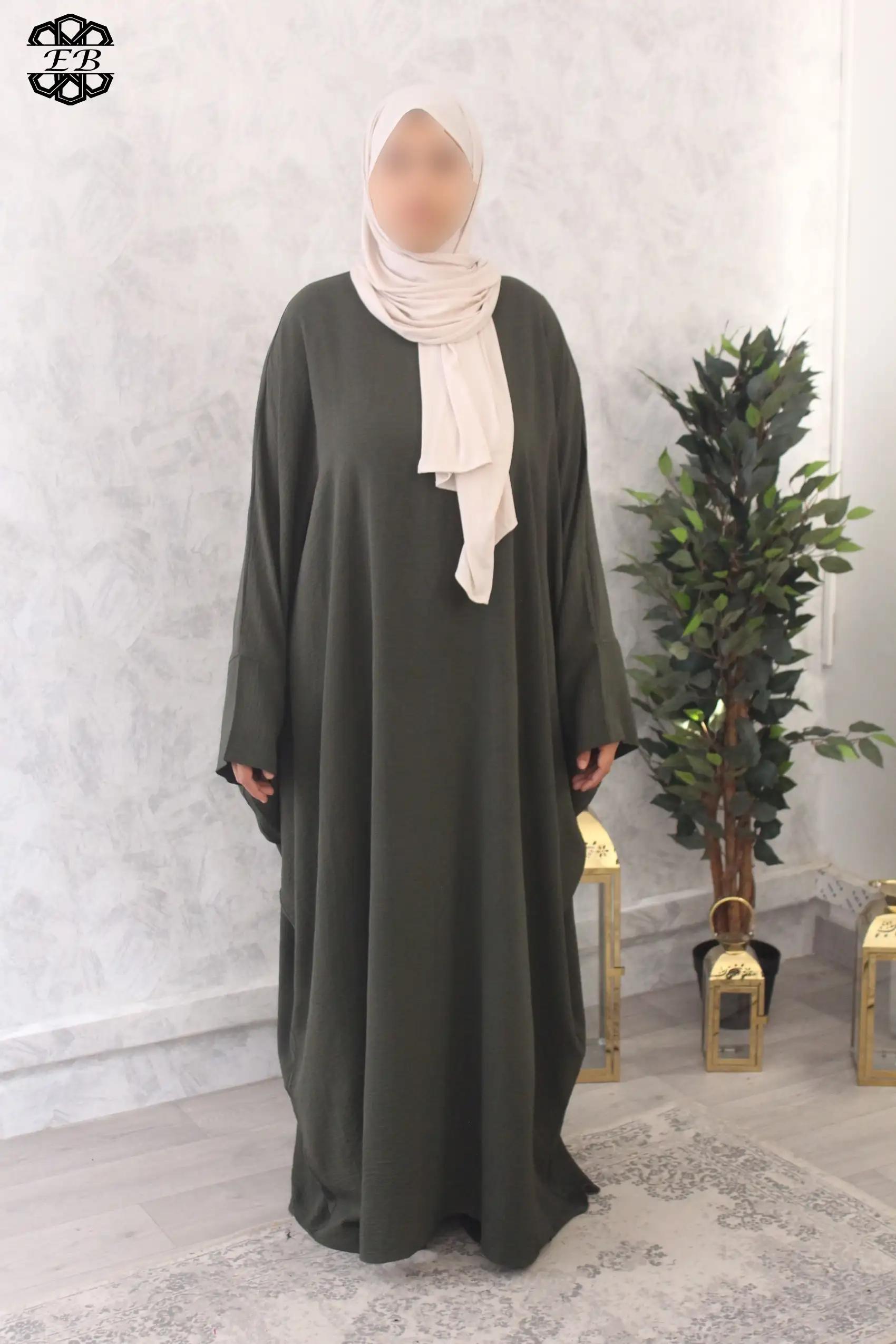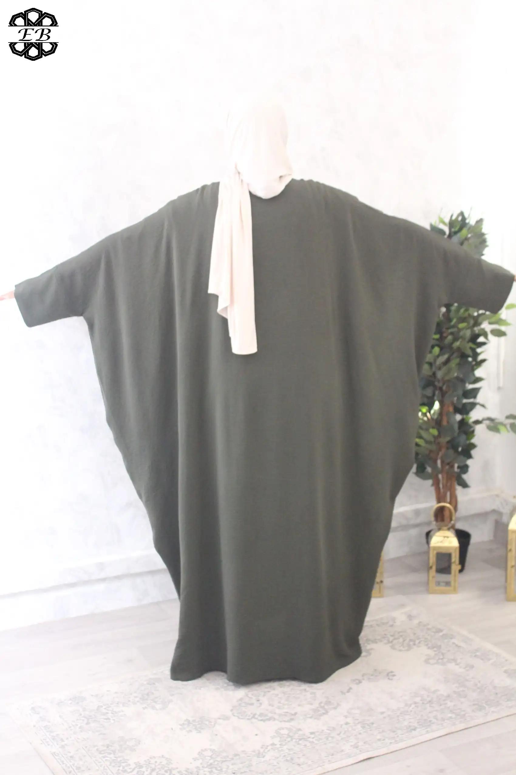 Abaya saoudienne Jazz Kellya by El Bassira Radya p avec manches droites ouvertes pour femme musulmane voilée. Disponible en taille T54/1m60 (1m60-1m65/90 kg max) jusqu’à T60/1m75(1m75-1m80/140 kg max) . Tissu Jazz, mat et légèrement plissé, idéal pour toutes saisons.
