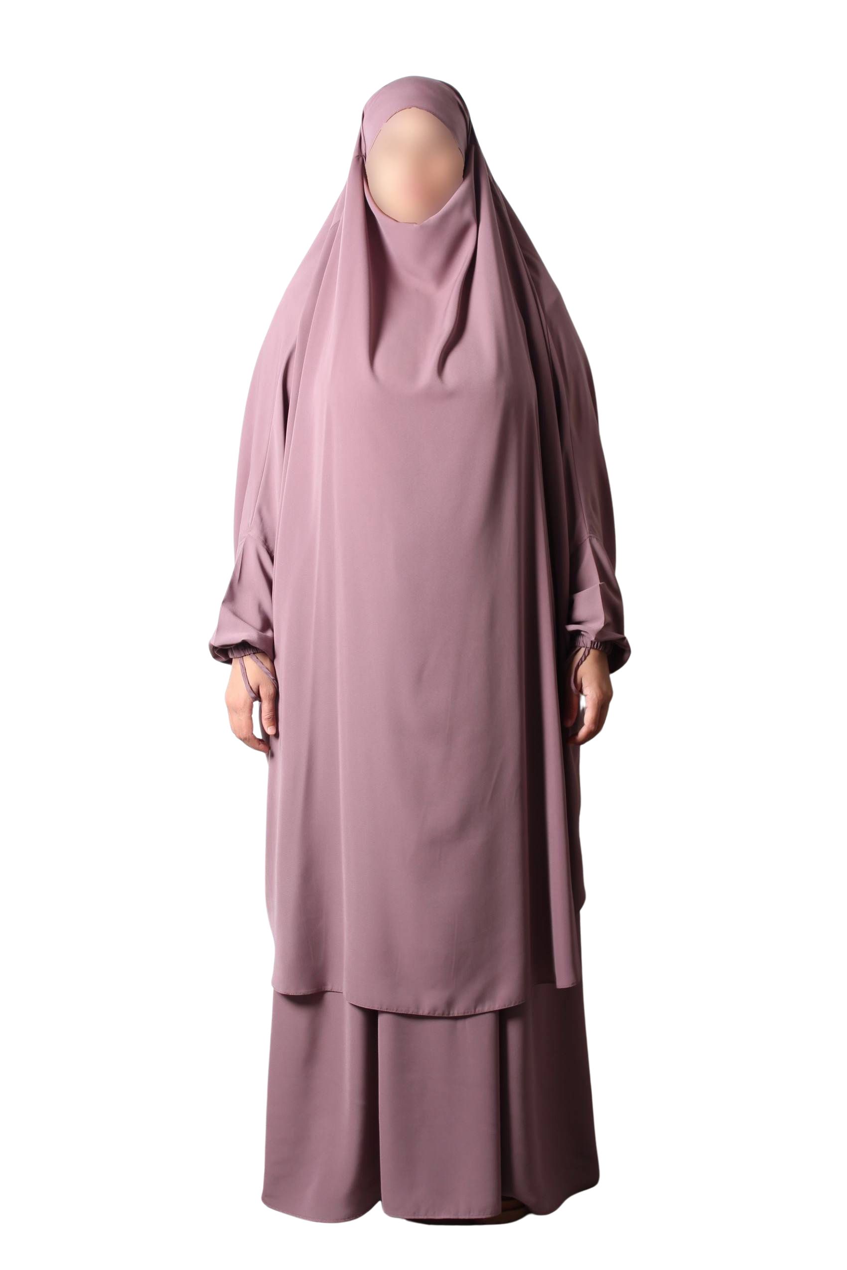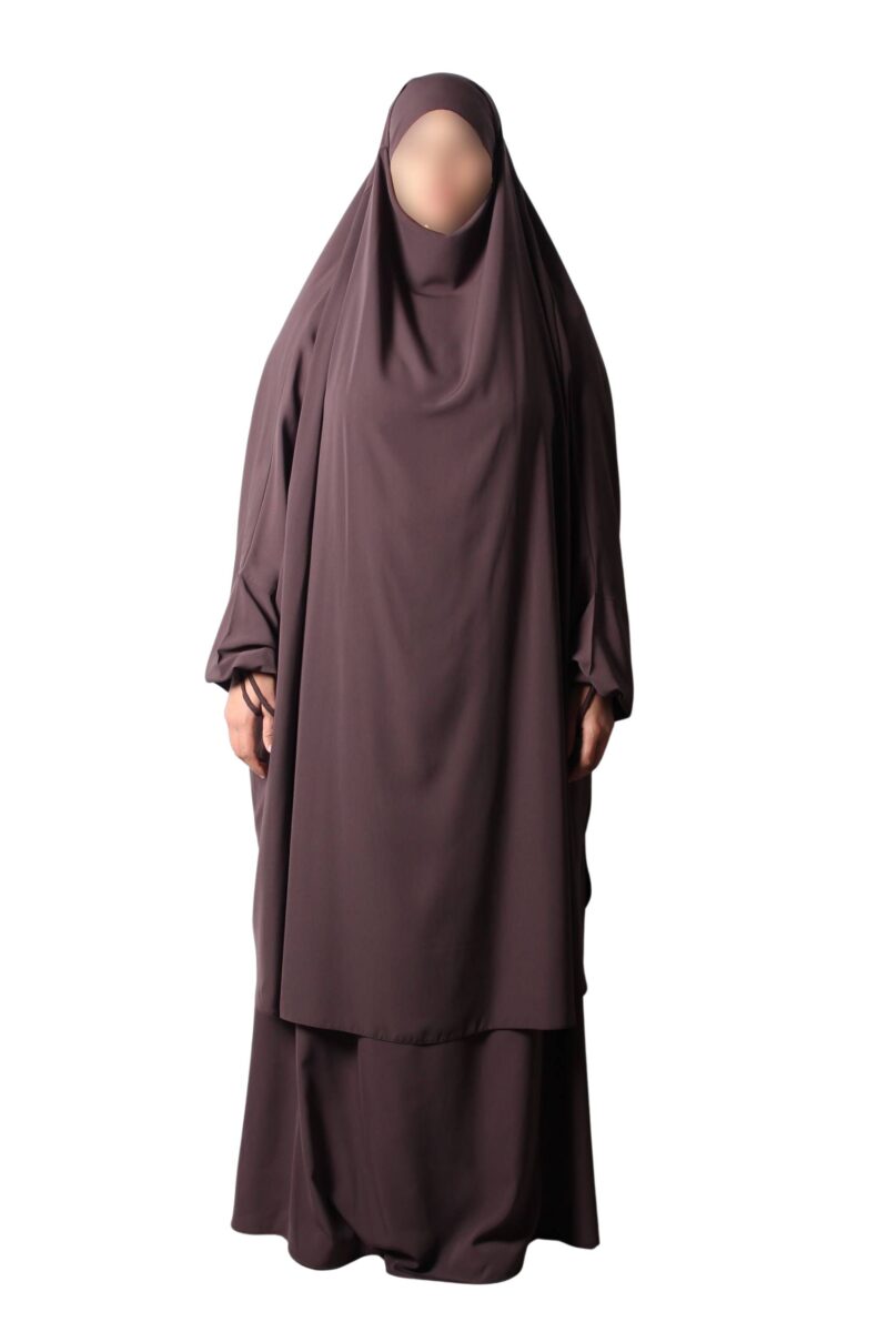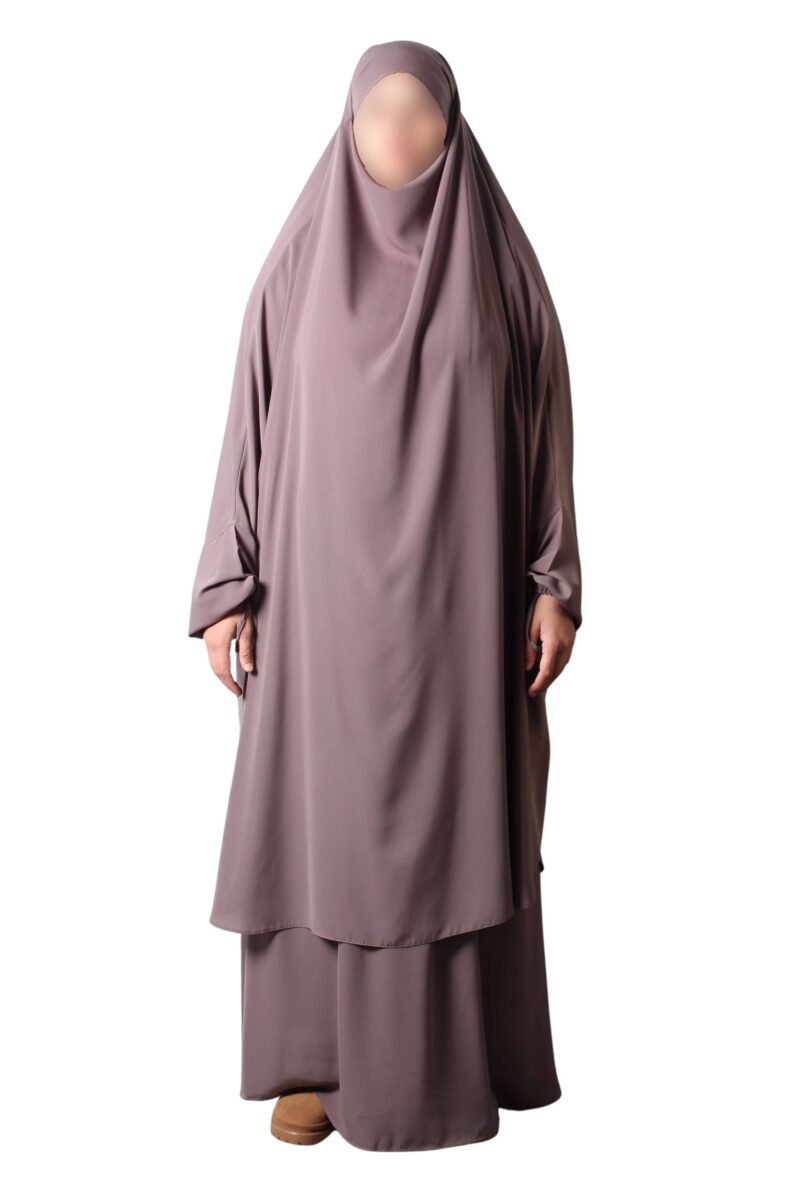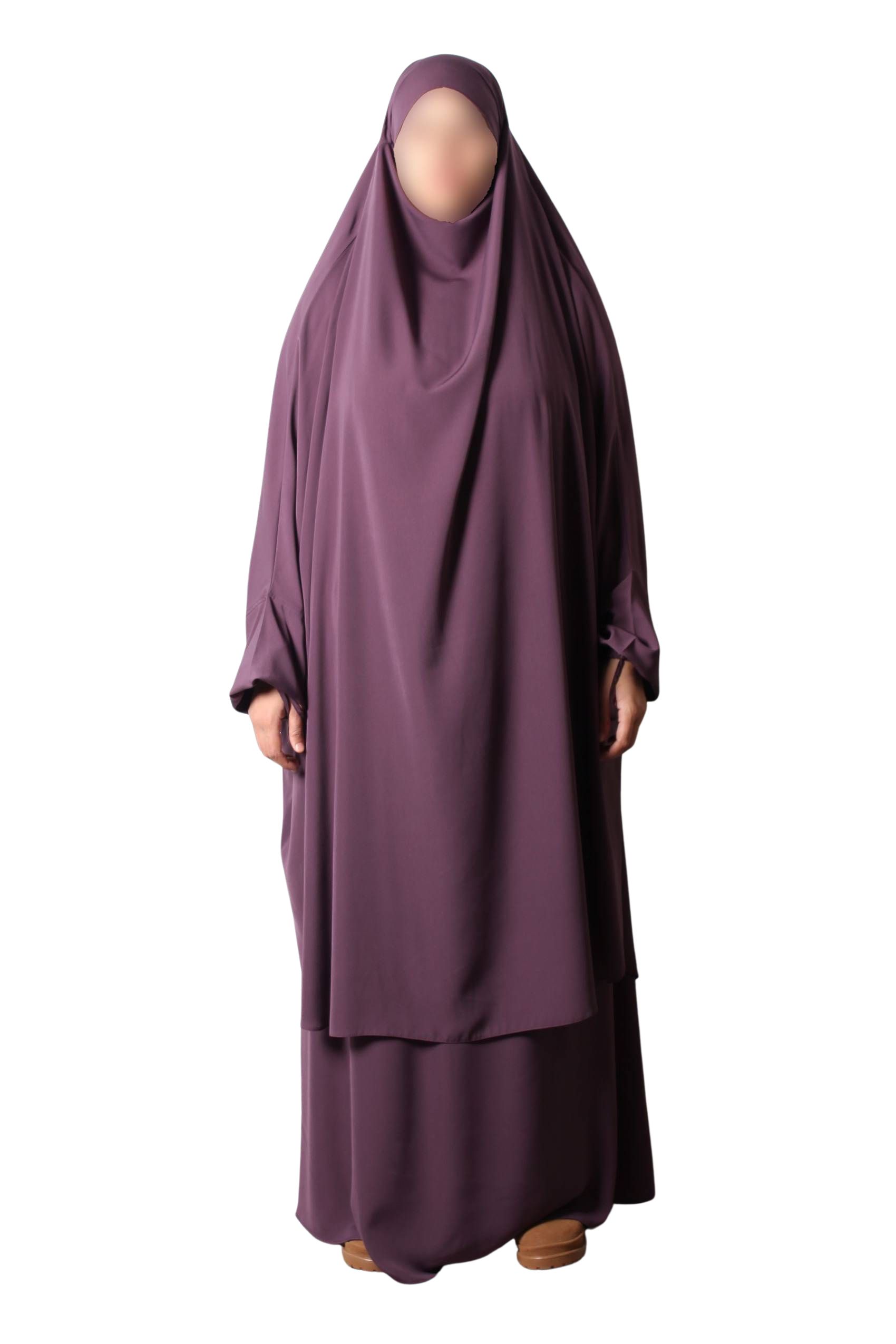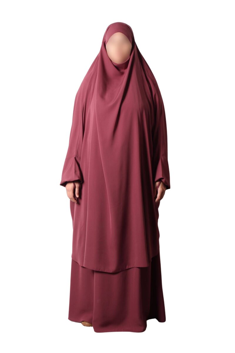 Jilbab 2 pièces jupe évasée Wool Peach El Bassira pour femme musulmane voilée. Disponible en taille t52/1m55 jusqu’à t62/1m80. Tissu Wool Peach mat et très léger. Agréable à porter en toutes saisons.