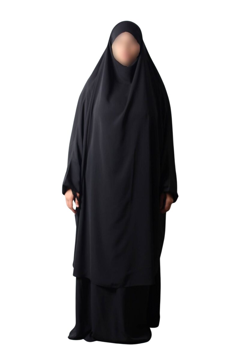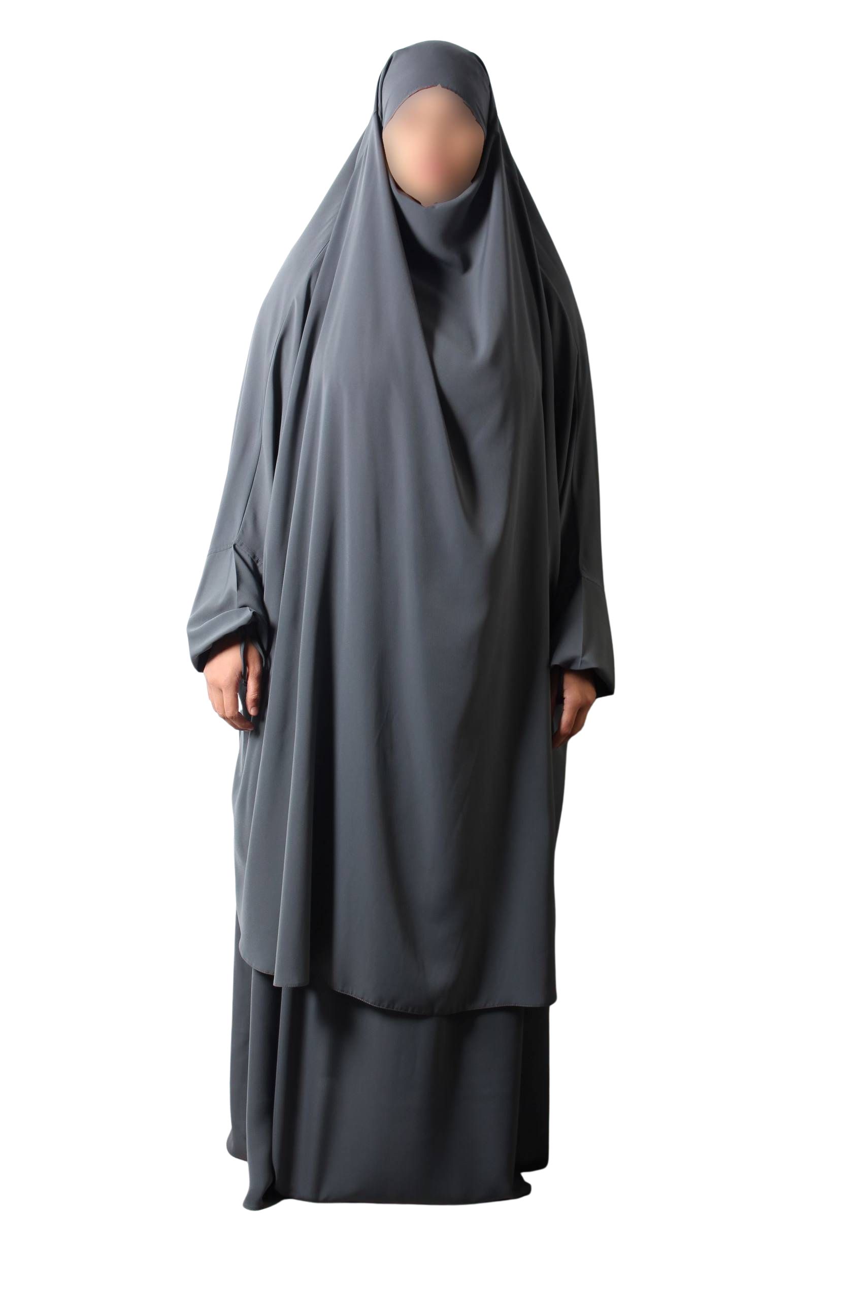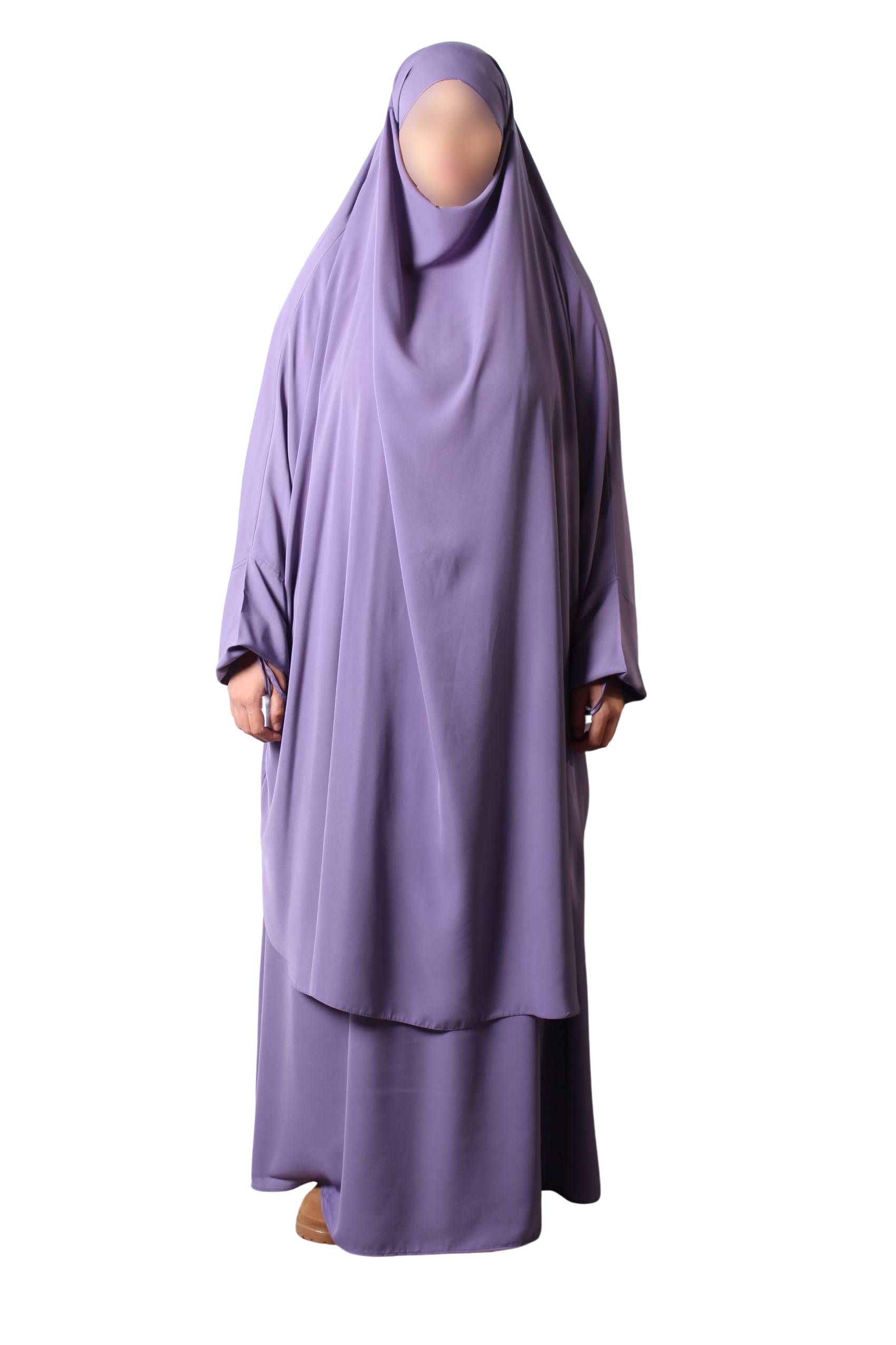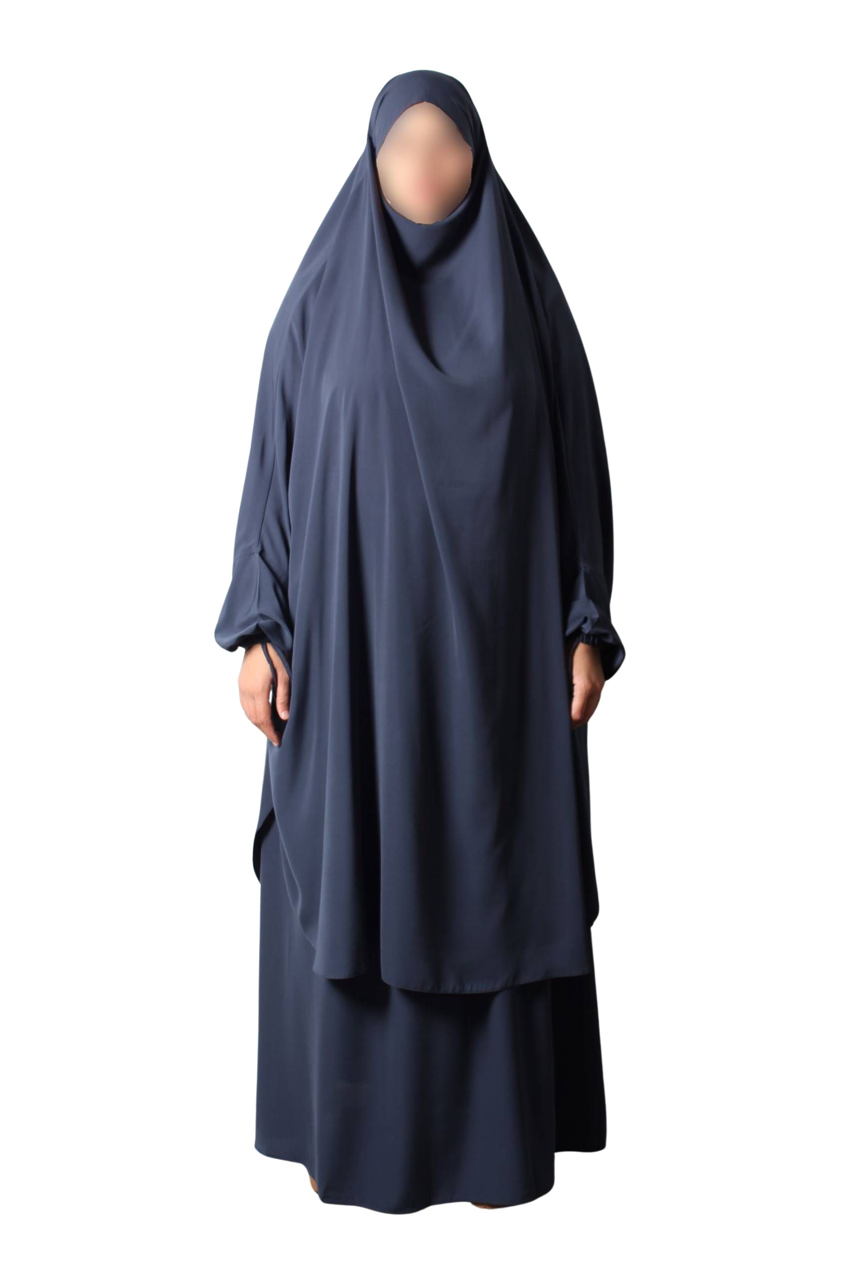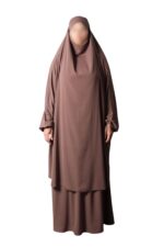 Jilbab 2 pièces jupe évasée Wool Peach El Bassira pour femme musulmane voilée. Disponible en taille t52/1m55 jusqu’à t62/1m80. Tissu Wool Peach mat et très léger. Agréable à porter en toutes saisons.
