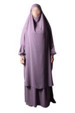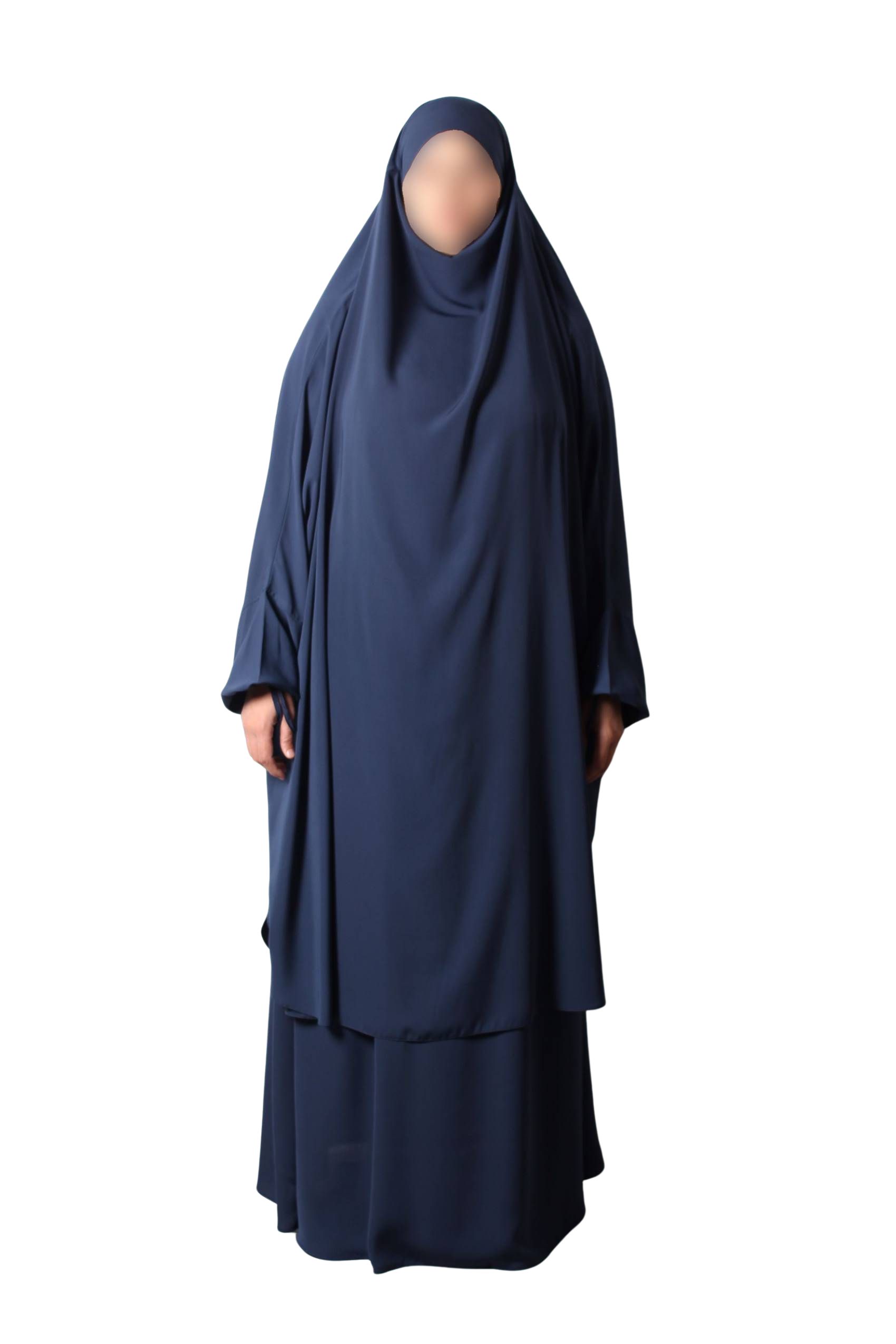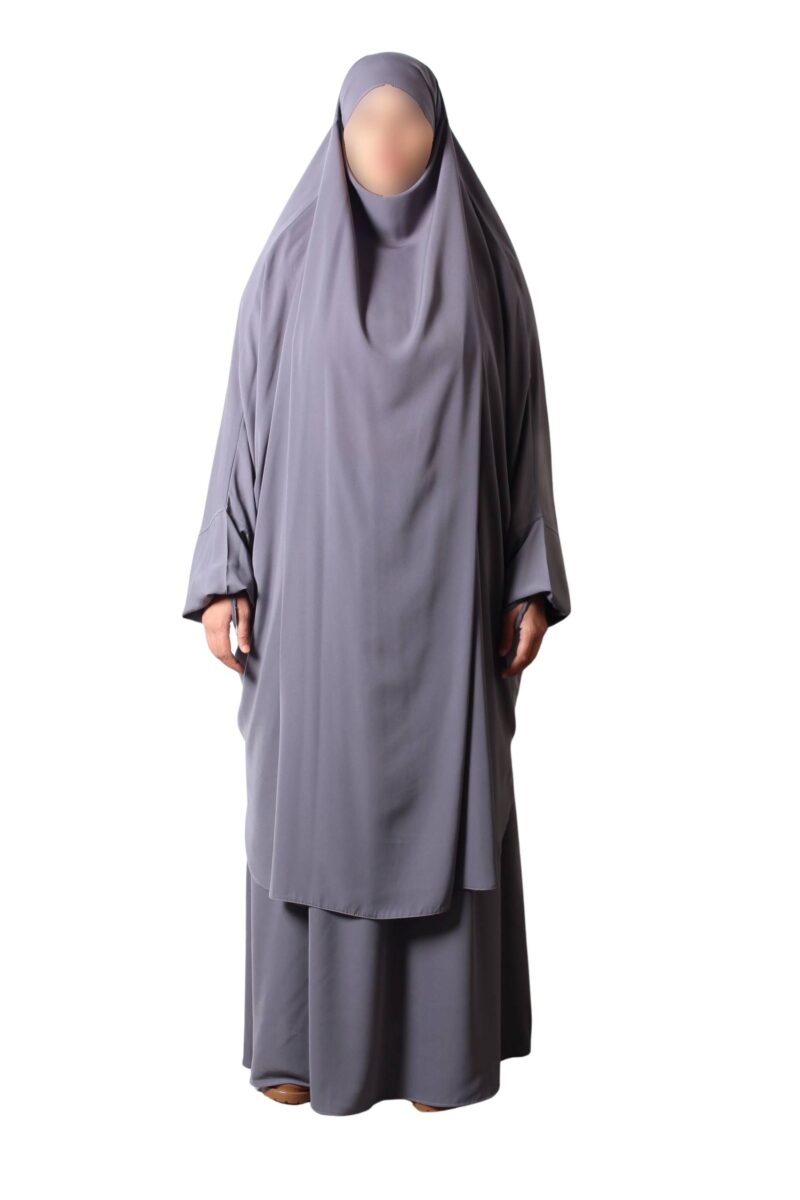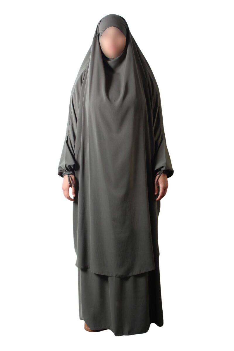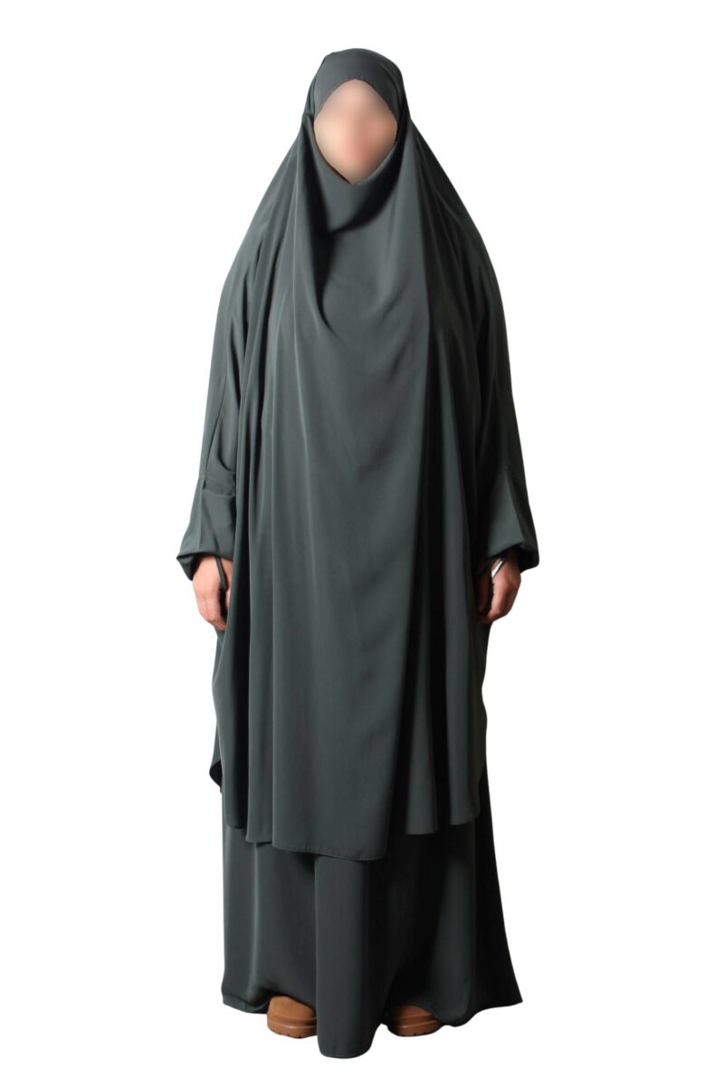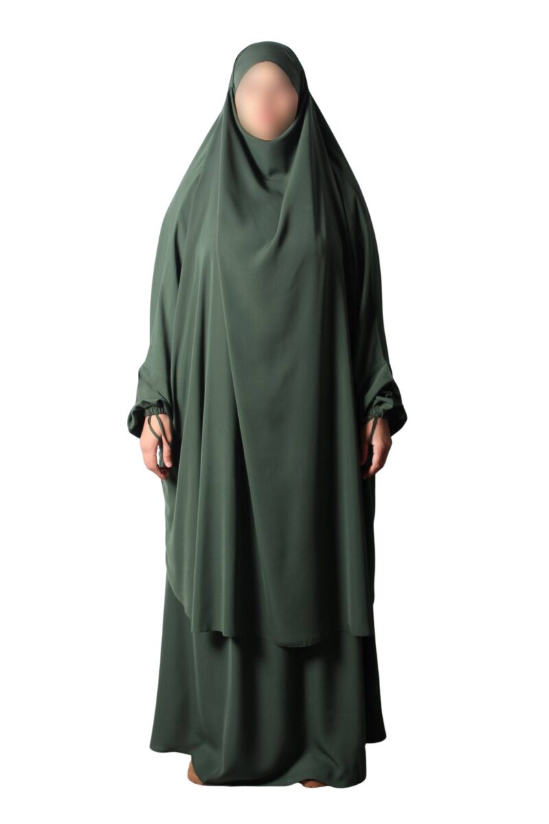 Jilbab 2 pièces jupe évasée Wool Peach El Bassira pour femme musulmane voilée. Disponible en taille t52/1m55 jusqu’à t62/1m80. Tissu Wool Peach mat et très léger. Agréable à porter en toutes saisons.