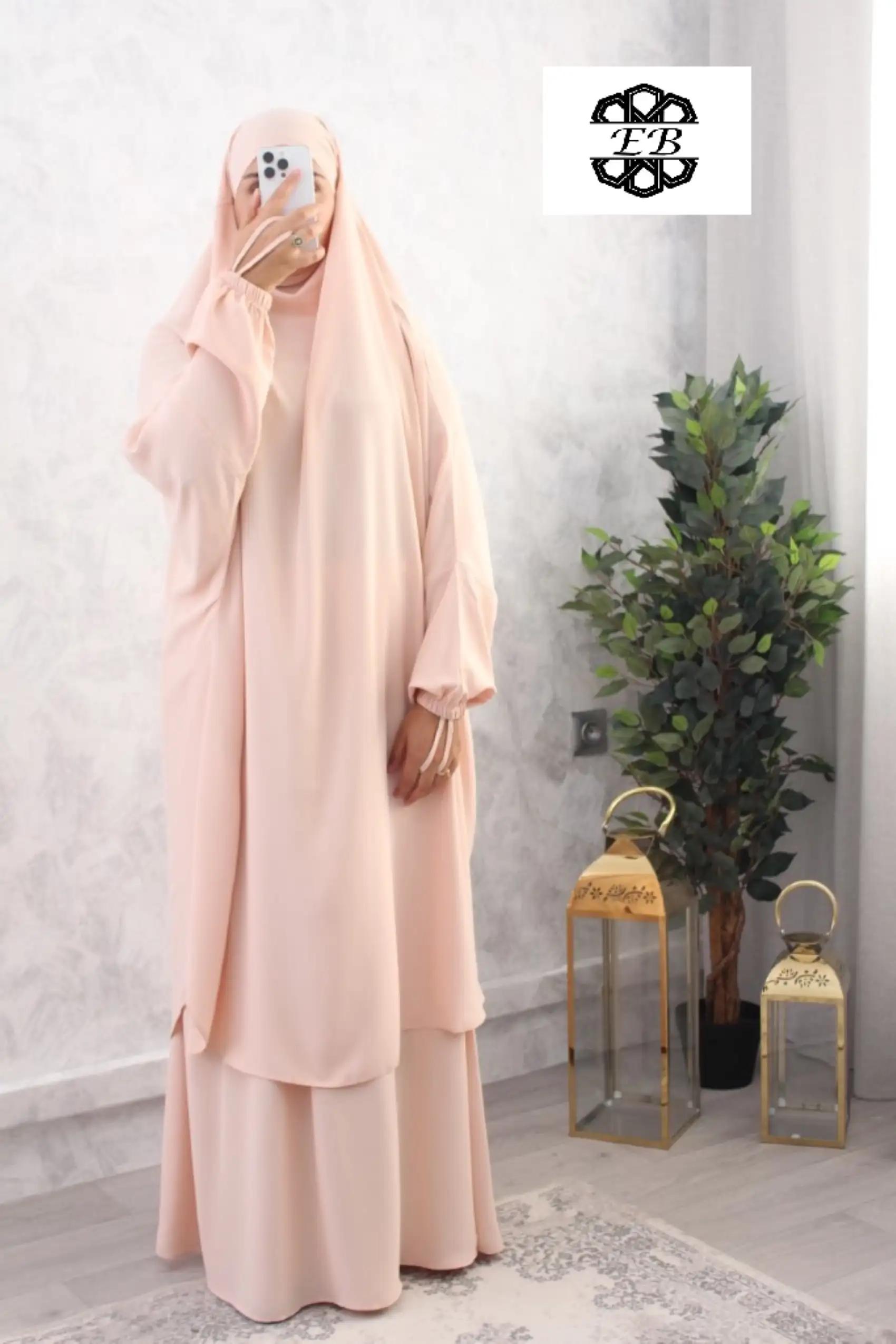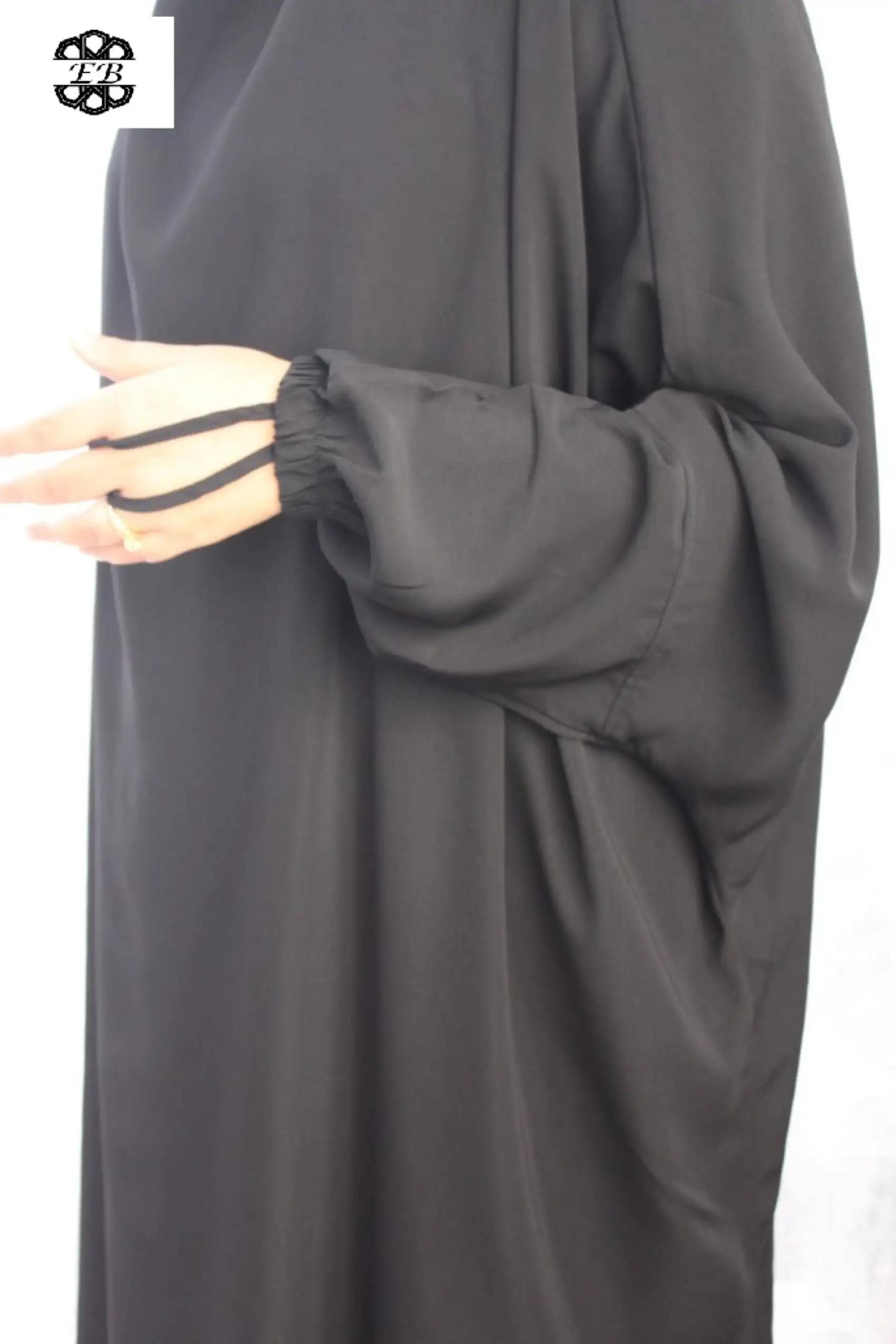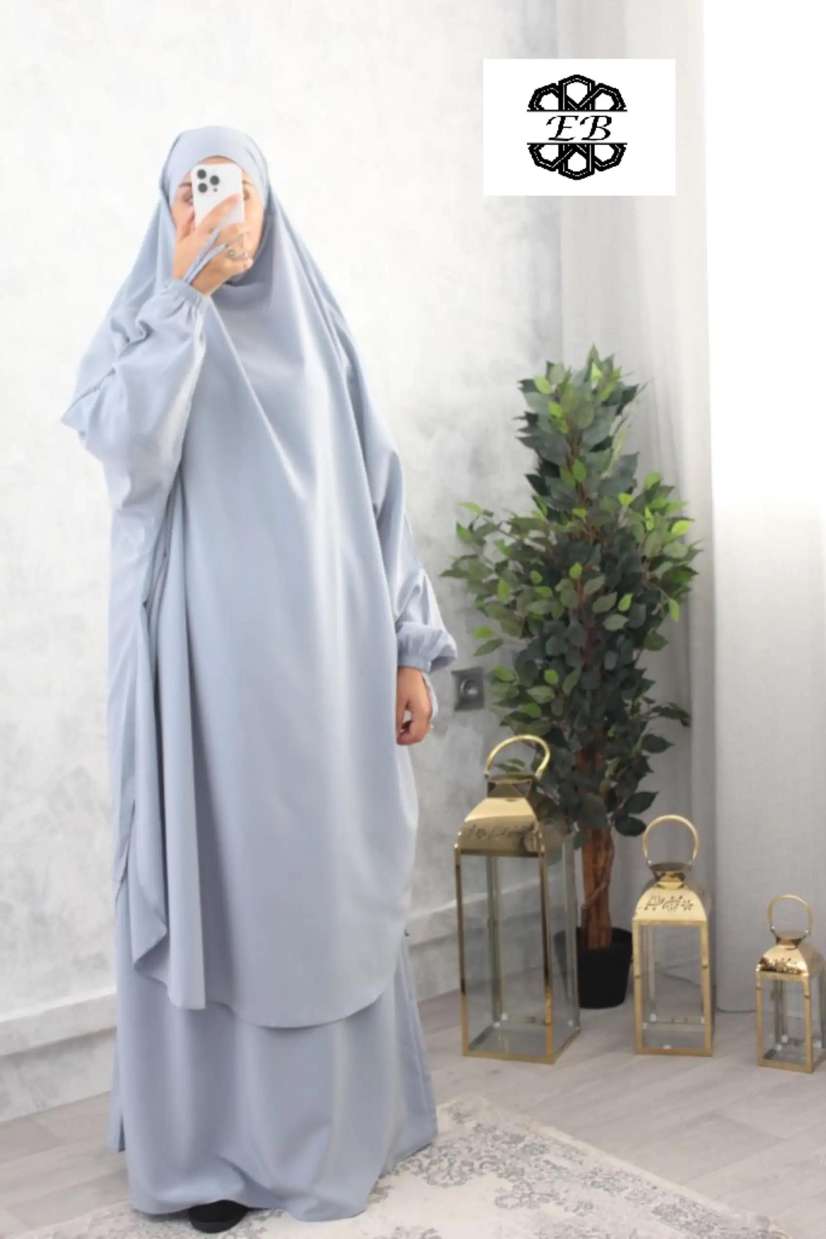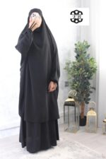 Jilbab 2 pièces jupe koshibo El Bassira pour femme musulmane voilée avec jupe évasée. Disponible en taille t54/1m60 jusqu’à t64/1m85. Tissu légèrement satiné, plutôt épais et résistant. Idéal pour le vent et la pluie.