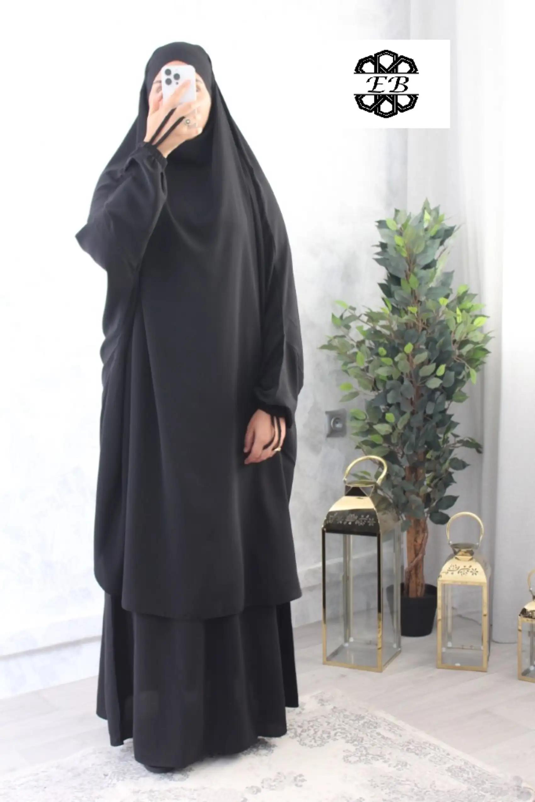 Jilbab 2 pièces jupe noir intense Fursan haut de gamme El Bassira pour femme musulmane voilée avec jupe évasée, qui dispose d’un cordon pour resserrer la taille. Disponible en taille t1/155-162cm jusqu’à t4/175-183cm. Tissu Fursan haut de gamme doux, avec un léger effet satiné, fluide et assez lourd. Idéal pour le printemps été et les occasions.