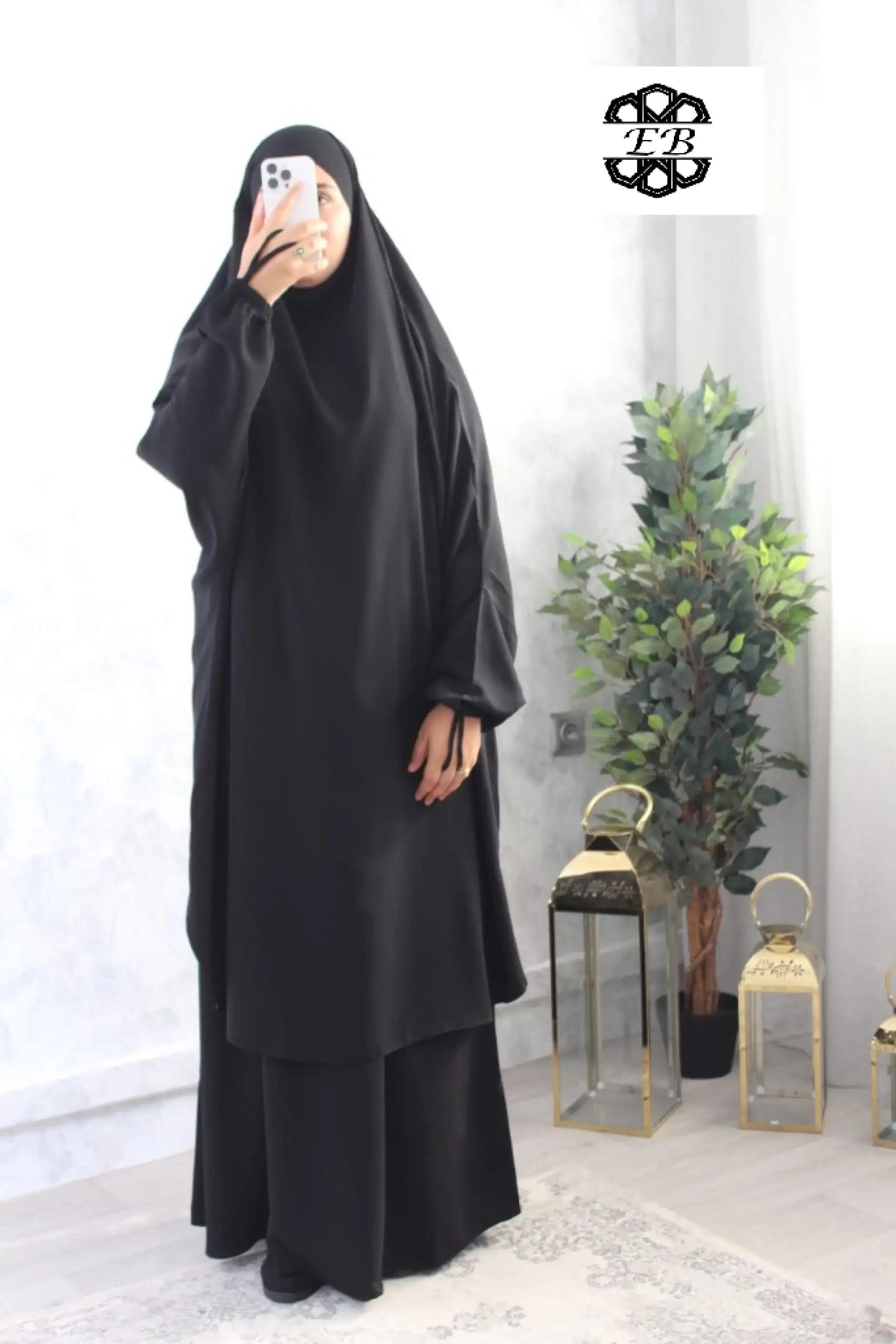 Jilbab 2 pièces jupe noir intense wool peach El Bassira pour femme musulmane voilée avec jupe évasée, qui dispose d’un cordon pour resserrer la taille. Disponible en taille t1/1m55-1m62 jusqu’à t4/1m75-1m83. Tissu wool peach microfibre léger idéal pour le printemps été.