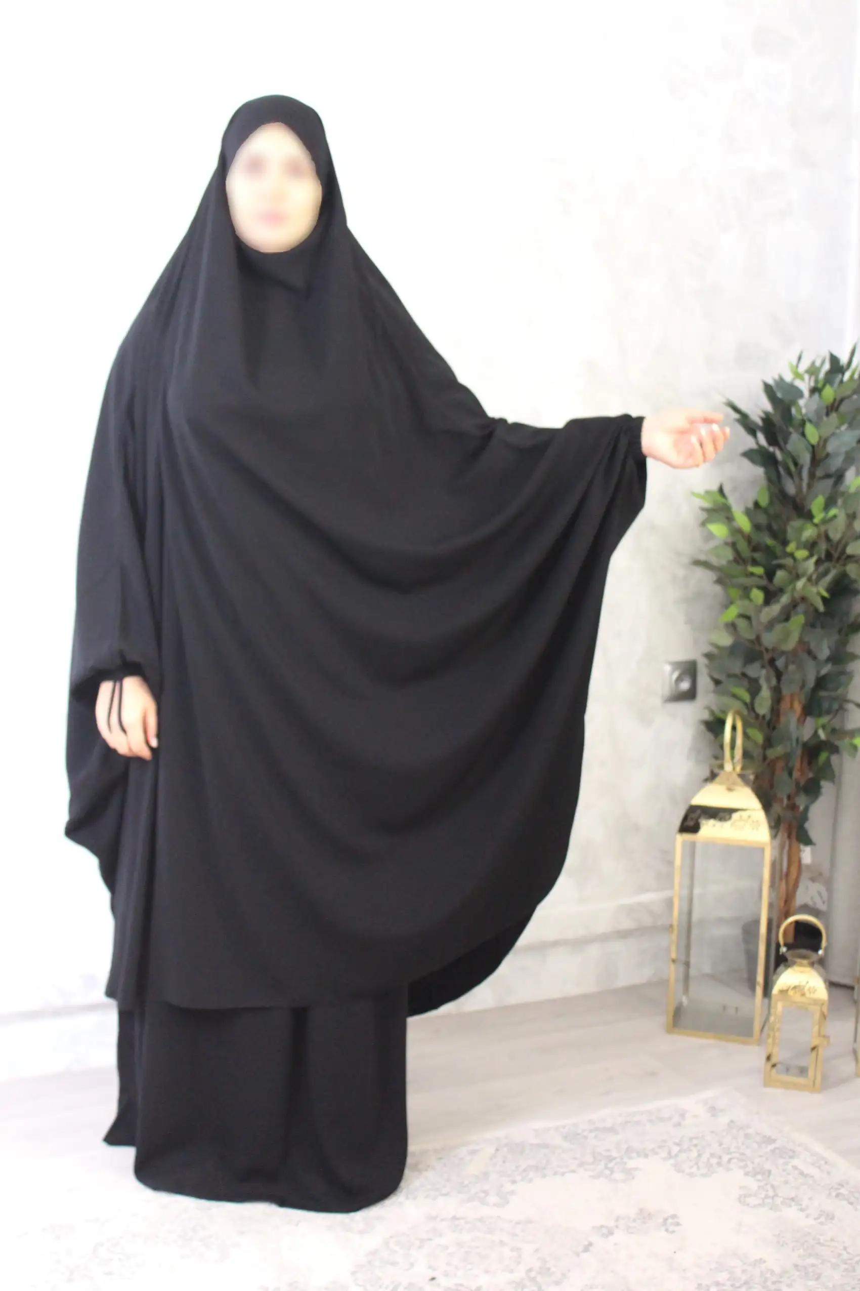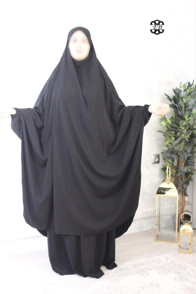 Jilbab papillon noir intense Caviary 2 pièces jupe El Bassira pour femme musulmane voilée avec jupe évasée qui dispose d’un cordon pour resserrer la taille. Disponible pour 1m55 à 1m83. Tissu Caviary crêpe adapté à toutes les saisons.