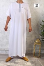 Qamis blanc manches courtes brodé de qualité El Bassira pour homme, disponible en taille T52/1m65-1m75 jusqu’à T64/1m95-2m.