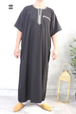 Qamis noir manches courtes brodé de qualité El Bassira pour homme, disponible en taille T52/1m65-1m75 jusqu’à T64/1m95-2m.