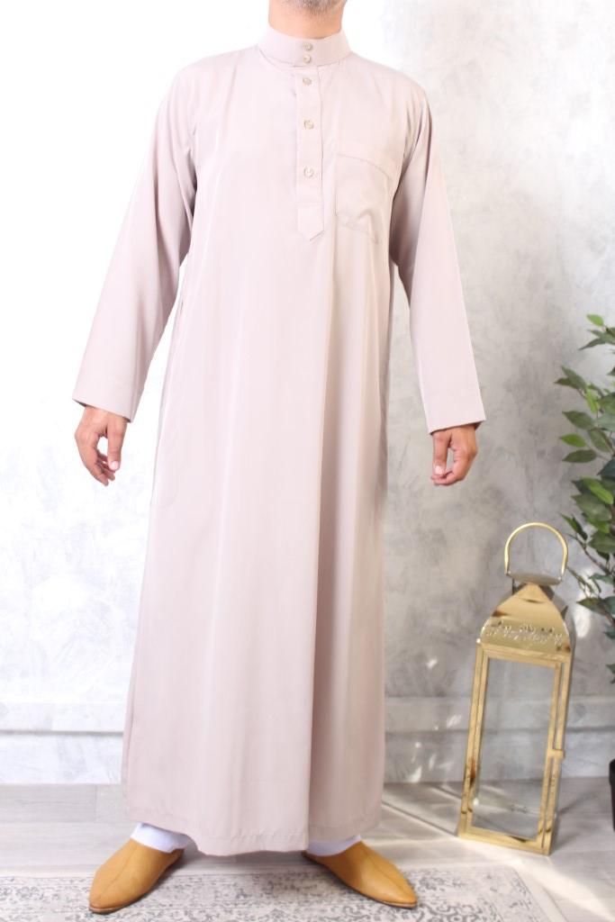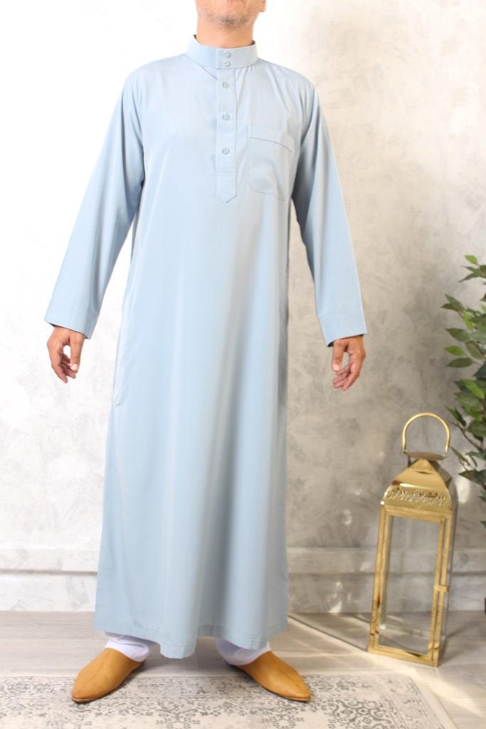 Qamis saoudien col mao manches longues de qualité El Bassira pour homme, taille 52/S(1m65-1m75) jusqu’à T58/XL(1m80-1m90)
